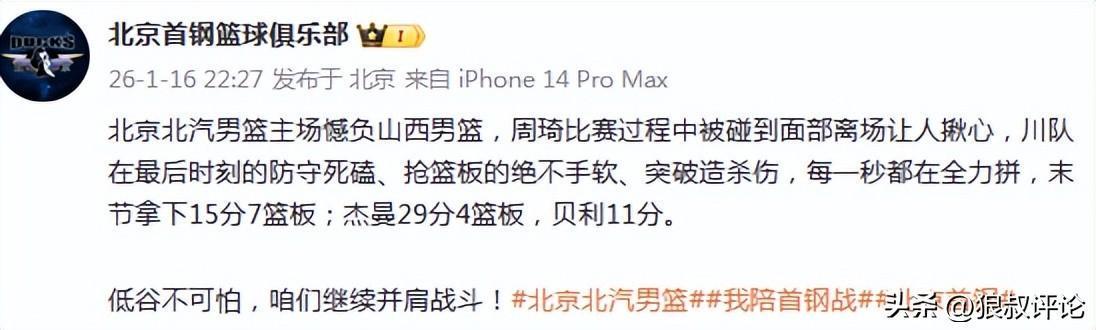 北京官方社媒发文:北京北汽男篮主场憾负山西男篮,周琦比赛过程中被碰到面部离场让人揪心,川队在最后时刻的防守死磕、抢篮板的绝不手软、突破造杀伤,每一秒都在全力拼,末节拿下15分7篮板;杰曼29分4篮板,贝利11分。